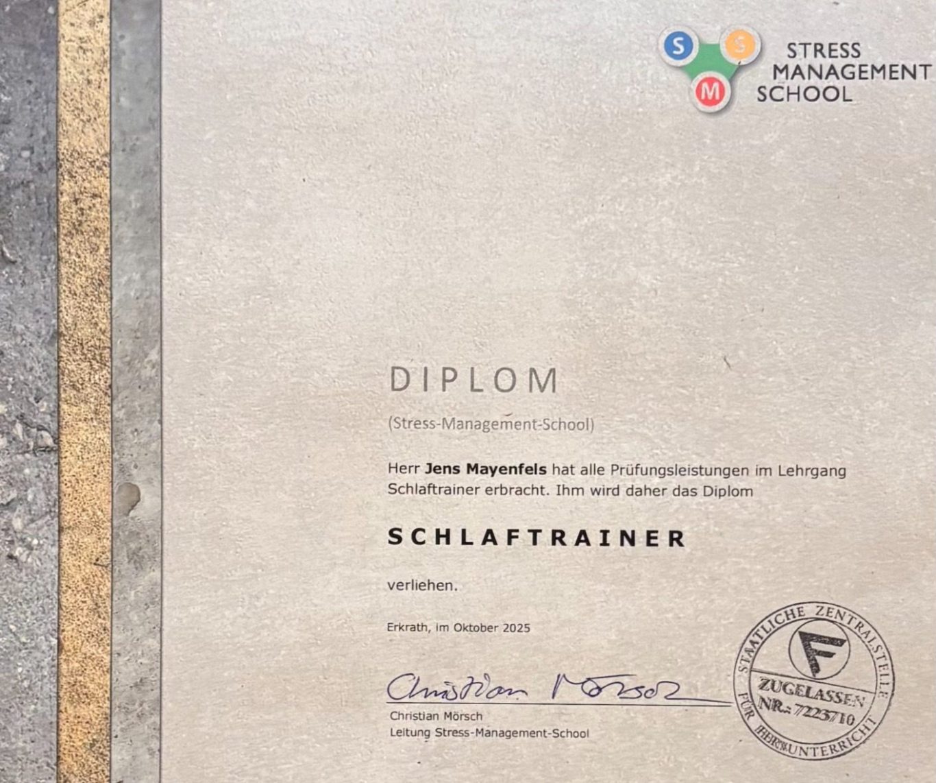 Jens Mayenfels: Präventionsberater für psychosoziale Gesundheit, Stress- und Mental-coach(IST), zert. Schlaftrainer (Stress-Management-School), Fachkraft für Zeitmanagement (IHK)